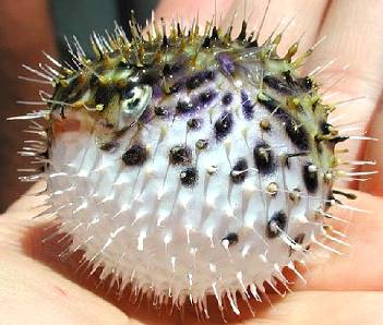 當(dāng)這種樣子怪怪的魚想讓自己看起來更大、更兇猛時(shí),它們會(huì)大口大口的喝水。一些種類的鲀魚在膨脹時(shí),成排的刺毛會(huì)豎起來,其中一種因此被稱作豪豬魚,這一特點(diǎn)讓它們比其他類型的鲀魚更強(qiáng)一些。盡管如此,對(duì)小魚來說,海洋環(huán)境仍是兇險(xiǎn)重重。即使看起來像一個(gè)長滿刺的球,它們?nèi)詿o法阻止大鯊魚的進(jìn)攻,海洋中到處都有鯊魚。這也是一些鲀魚增加有毒保護(hù)層的原因。事實(shí)上鲀魚是地球上毒性位居第二的脊椎動(dòng)物,毒性僅次于黃金箭毒蛙。那些在日本餐館的菜單上看到“鲀魚”字樣的人,應(yīng)該謹(jǐn)記這種動(dòng)物是有毒的。 |