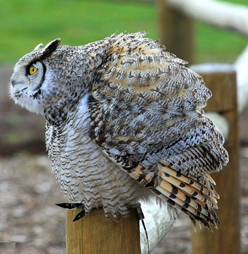 大部分鳥類都能讓自己的羽毛蓬松起來,但是貓頭鷹卻把這種能力當(dāng)作一種保護(hù)策略。即使巨角貓頭鷹也有天敵(經(jīng)常是鷹),因此它們必須通過讓羽毛蓬松起來,讓自己看起來更大,來威懾攻擊者,用這一招對(duì)付愛投機(jī)取巧的老鷹,非常管用。即使雪鷗(Snowy Owls)也用這招躲避天敵襲擊,雖然在北極冬天白雪皚皚的環(huán)境映襯下,一身雪白的雪鷗很難被發(fā)現(xiàn),但是到了春天,它的白羽毛會(huì)脫落,長出一身顏色更暗的羽毛,這時(shí)的它們很容易成為天敵的捕獵目標(biāo)。 |