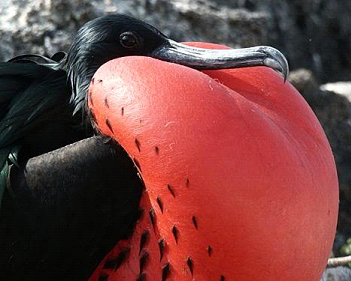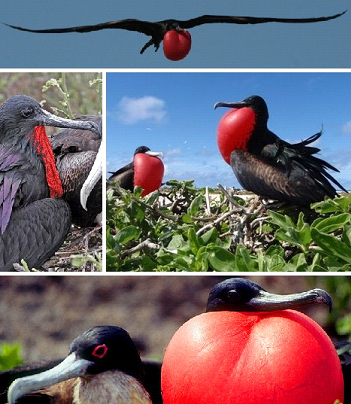軍艦鳥在熱帶地區(qū)筑巢,生活在那里它們很容易找到食物,例如魚和小海龜?shù)群Q笊?。雄軍艦鳥會(huì)向“女士們”展示它們胸部的鮮紅色“喉囊”,通過充氣,雌軍艦鳥會(huì)認(rèn)為它們的喉囊很耀眼,很美觀。雌鳥沒有這種喉囊,只有一些白色羽毛。軍艦鳥還會(huì)通過騷擾其他帶著獵物歸來的海鳥獲得食物。通過對(duì)其他正在飛行的鳥兒進(jìn)行干擾,它們經(jīng)常會(huì)得到從其他海鳥嘴里掉落下來的食物。 |